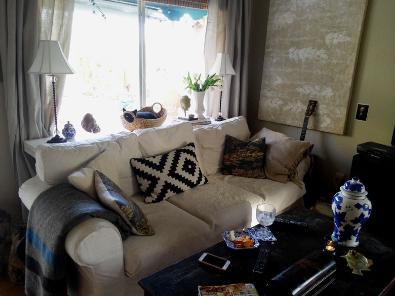 Harry and soft furnishings: pillows made from fabric of vintage drapes – a mid century modern brutalist style.
