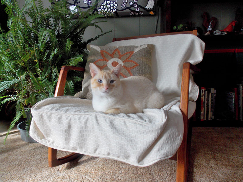 This is Sphynx. He is my second rescue cat….. and by rescue I mean someone dropped him off in my neighborhood to die and he found us….. He showed up last spring, and lived on my back deck. My 9 year old son loves him, so much so that he takes him sledding. Yes, the cat loves it. So, when the weather turned and the temps got into the negative double digits- we took him to the vet, got him all fixed up and 6 weeks ago he came inside to live. He loves my mid century rocker. It’s where you can find him- unless he’s trying to curl up on your lap.