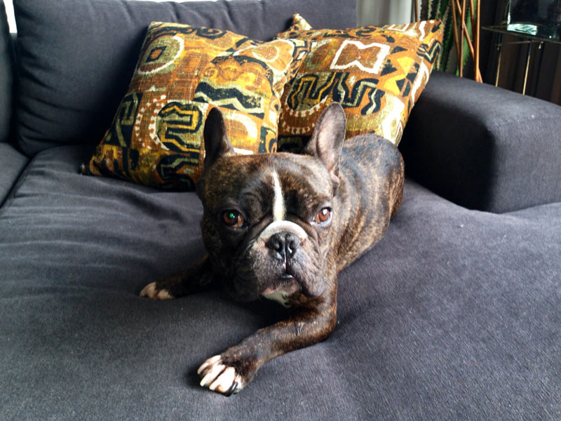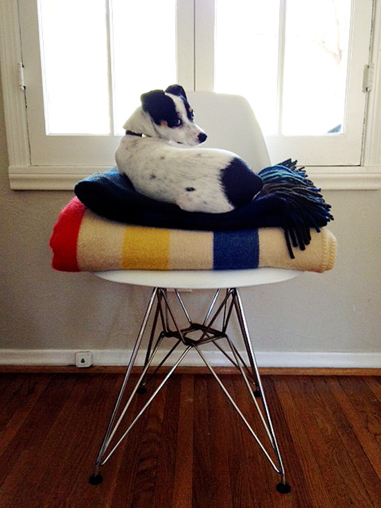Jackson is a rescue love child from a jack russel and chihuahua (we think) and our mascot. Funny enough….he rules the house and loves sitting on piles of vintage Levi’s or in this case, blankets stacked on an Eames molded plastic side chair. Smart puppy.