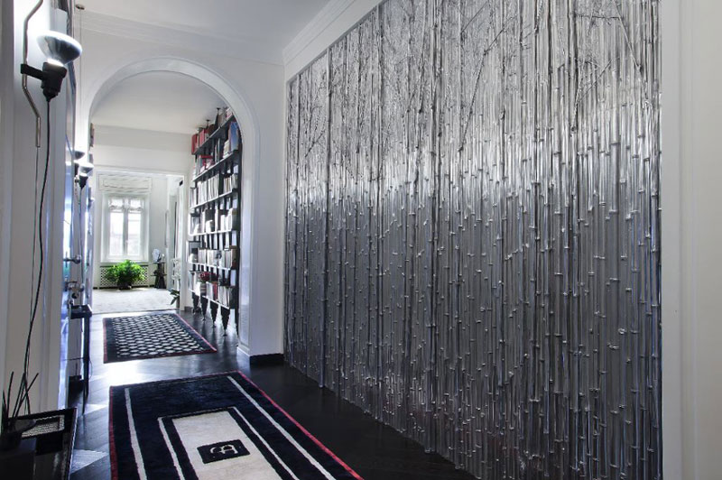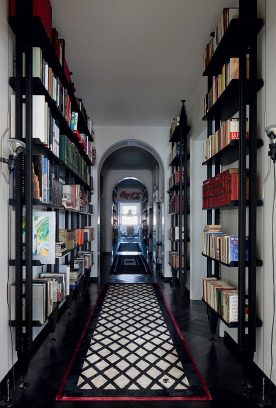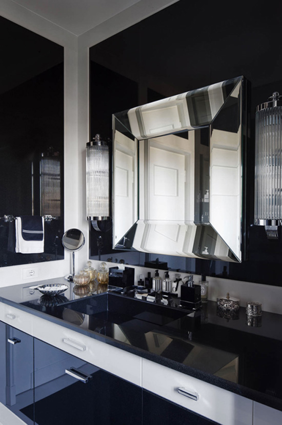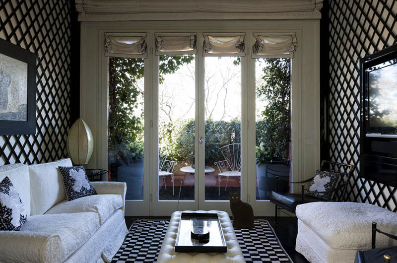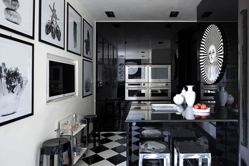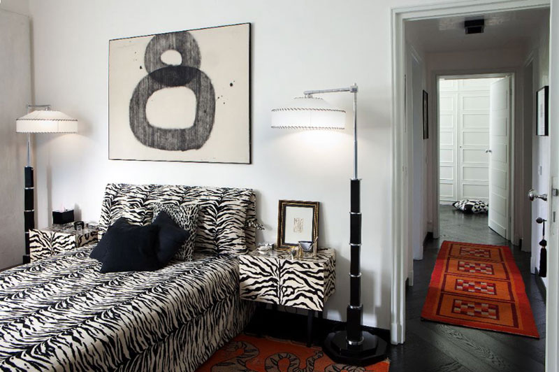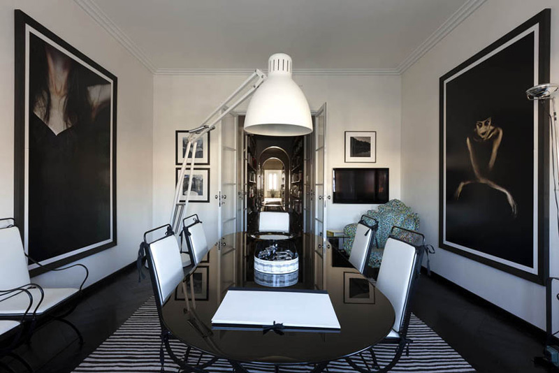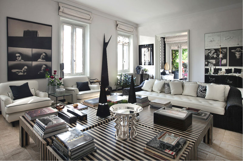 I bought a few Spanish decor magazines while on holidays (I had to leave them behind because my suitcase was overweight dammit!) and this eye-popping apartment was featured in one of them. It is located in Milan, in a building designed by noted Italian architect Giò Ponti, and is the home of Italian interior designer Barbara Falanga. This bold, graphic apartment is all about black and white, with retro furnishings from the 30s to the 70s. Glam with edge. Not for the timid!