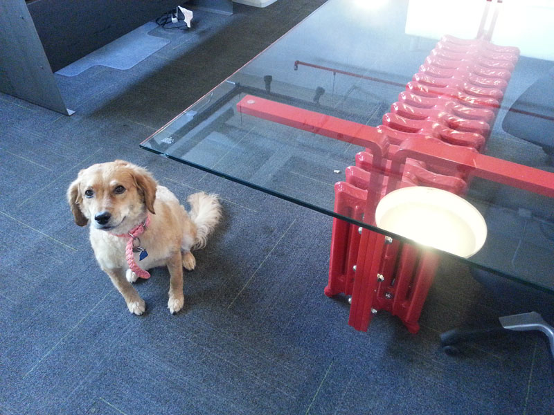 Her name is yoshimi and she comes with me to the office every Saturday. The table is made with a old radiator that I refurbished and applied a powder coat finish on it and I use as my conference table.