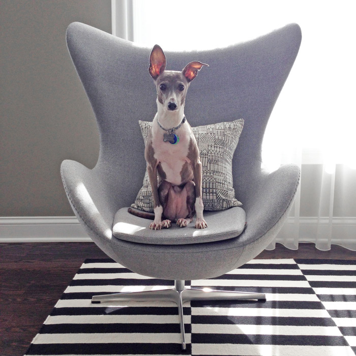 This is Bella, our rescued Italian Greyhound. Bella doesn’t waste any opportunity to jump up on our furniture when we are not looking. This is a photo of her on our Egg Chair, with her signature ‘deer in the headlights’ look.