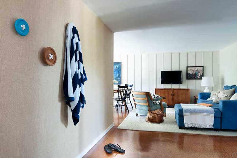 Lovely Interiors. Full of light and colour. The vivid pops of blue are great – the stools, blue sofa and bedside table – fab focal points. I adore the oversized buttons on the wall as hooks – so creative. The mirror in the bathroom really drawers you in and completes the space.