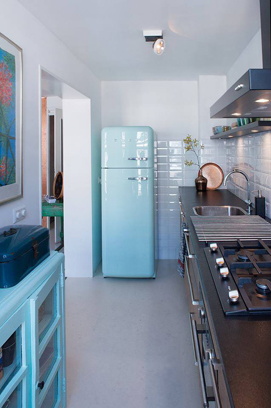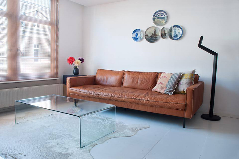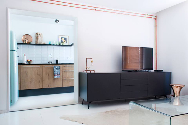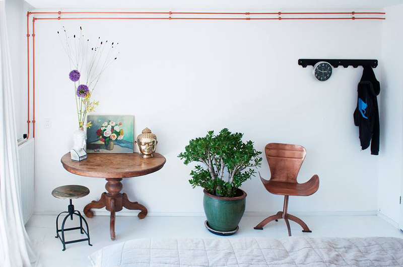 I mentioned back in this post that I loved exposed copper piping. Coincidentally, I came across an apartment in Amsterdam designed by Ijzersterk Interieurontwerp where exposed copper pipes snake through the living room, hallway and bedroom. To play off this theme, the designers included a copper coloured wall covering and chairs in the dining room and a matching butterscotch leather sofa and stool in the living room (among other things). I love me some exposed pipe…and some copper! (Photos by Figure of Speech)
