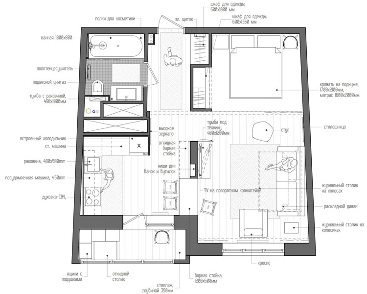 Here is another super cute apartment by Int2 architecture. Pastels a plenty are so soothing. The graphic details keep the space modern and the white walls and cabinetry lighten everything up. Lots to love in about 485 sq ft.