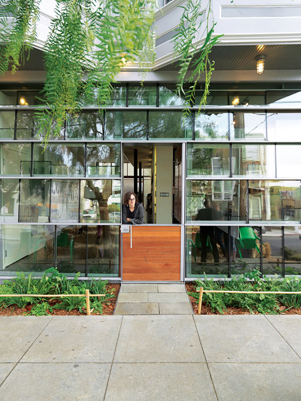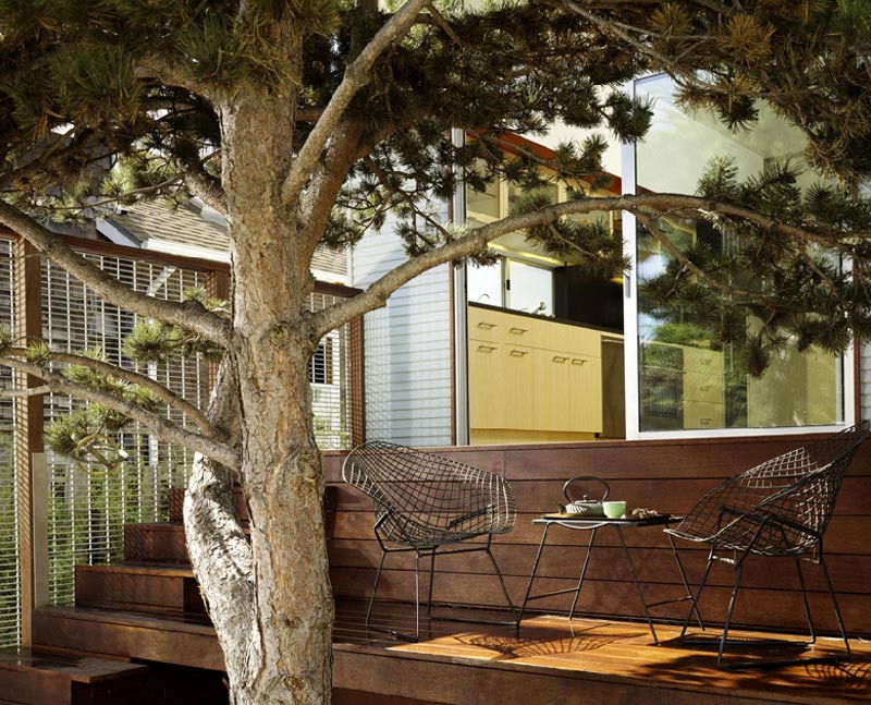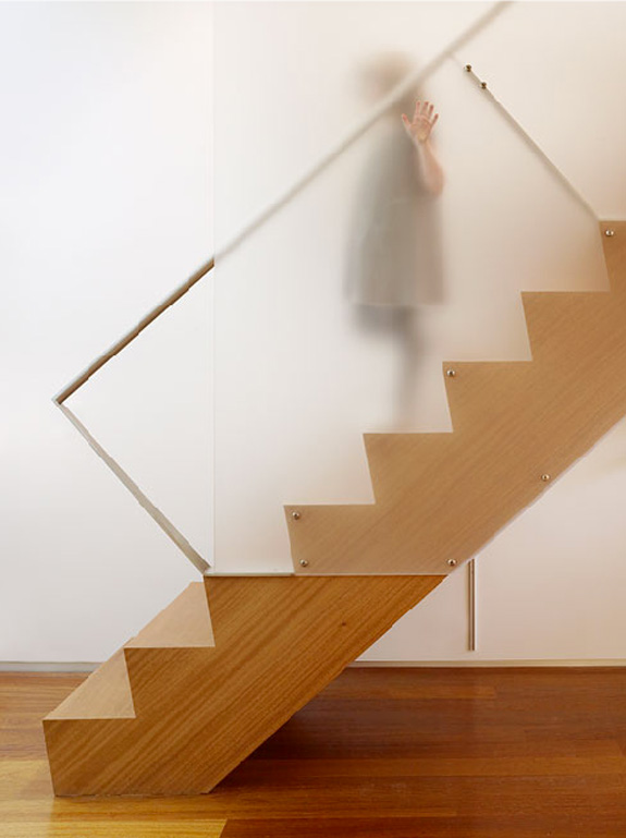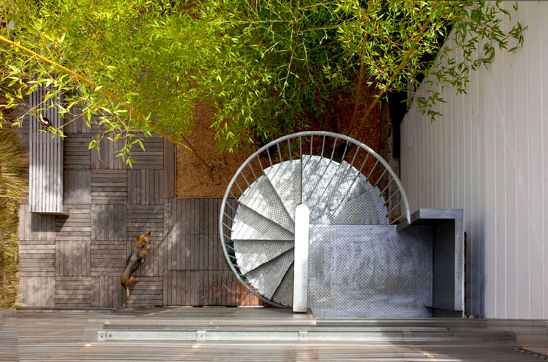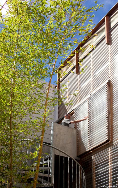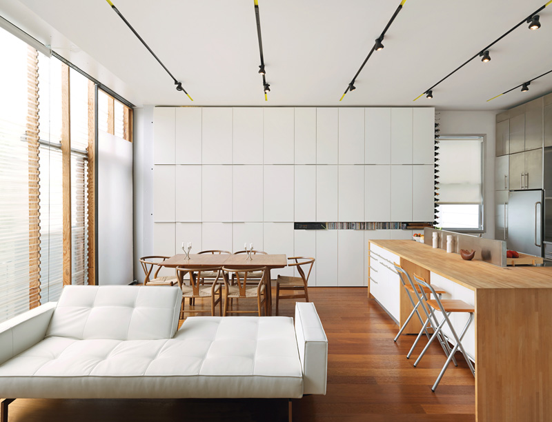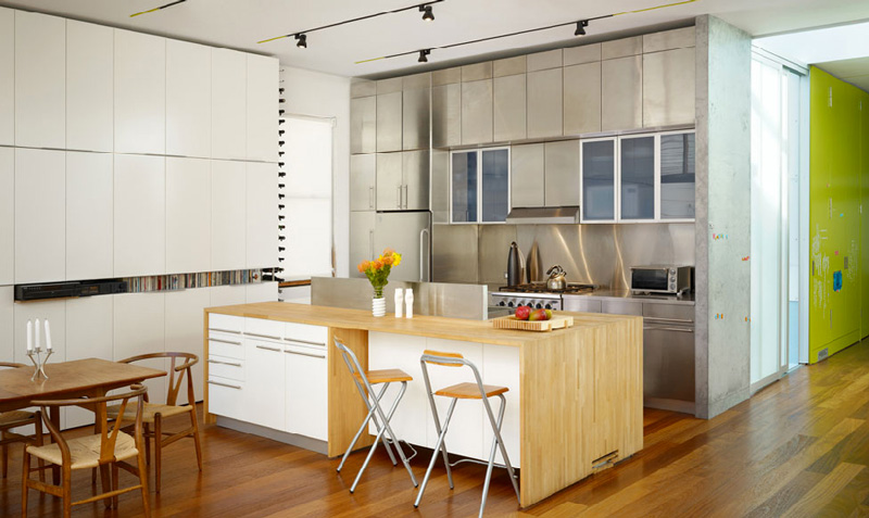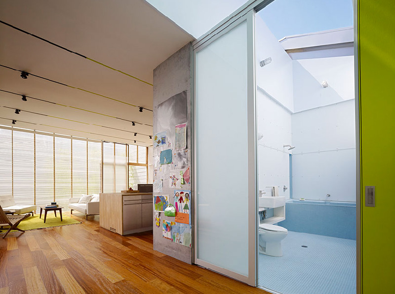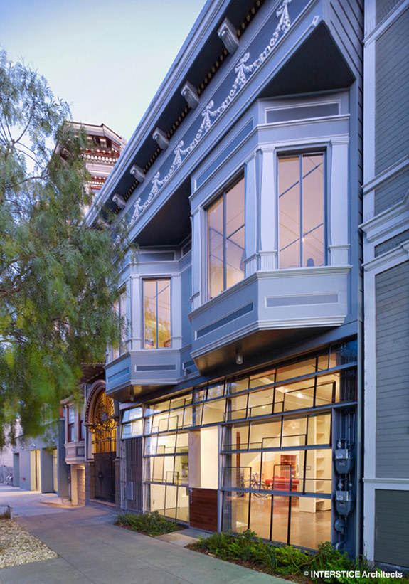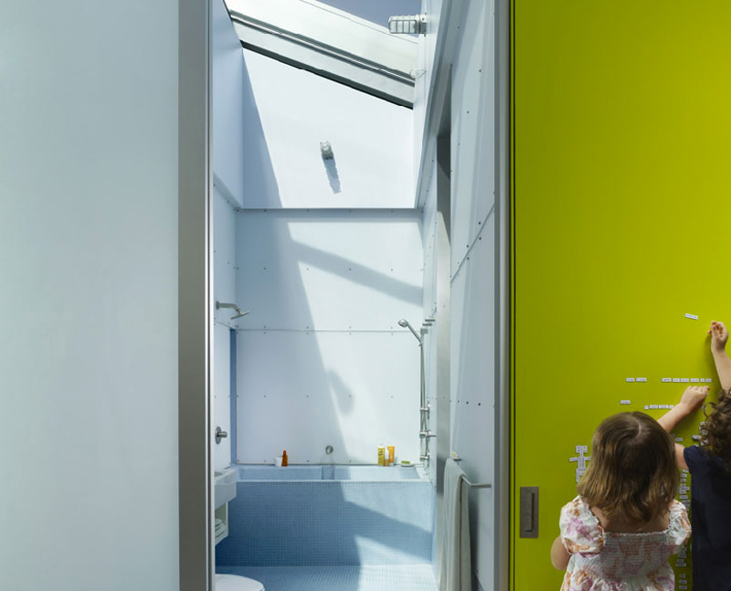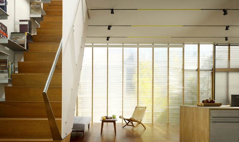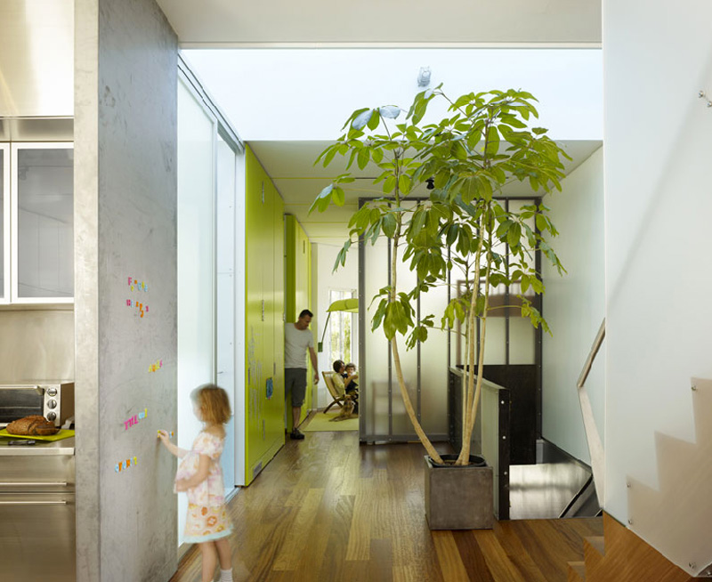 I love this house in the Mission district of San Francisco, home to architect Andrew Dunbar of Interstice Architects and his family. Typical SF Edwardian architectural details on the exterior front but then a really cool lower level facade (constructed from salvaged double-insulated window glass panels arranged in a shingle pattern) for the commercial level, with residential space on the second floor). It’s 3700 sq ft and was a sort of laboratory for the homeowners – experiments range from floors of expansive steel plates, walls of thermal plastics, and magnetic closet/display walls, to integrated passive energy strategies, ingenious waste-stream material reclamation, and high-tech thermal and solar power collection. I think that’s why I like it so much…there’s so much creativity and interesting details throughout. I am especially fond of their massive kitchen cabinet wall – about $12K worth of Ikea cabinets. Says Andrew: Small Ikea kitchens drive me crazy, but six kitchens’ worth of Ikea cabinets can be made into something beautiful. AMEN!