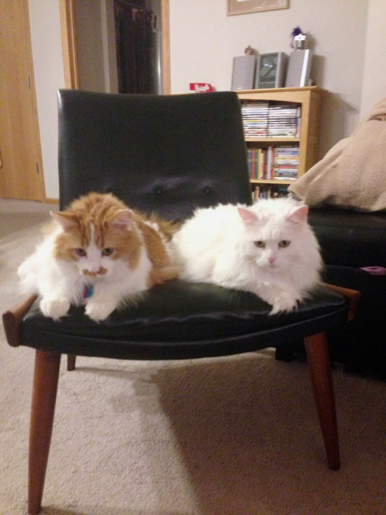 I scored a set of these amazing vintage chairs on craigslist recently. Our farm cats, Peaches and Seashell didn’t take long to make them their own!