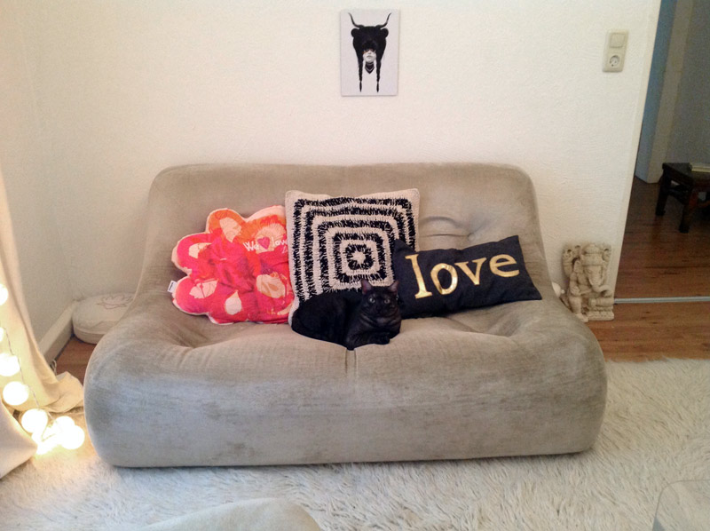 Please find enclosed a photo of my black smoke cat Siri from a Spanish animal shelter. She loves her/my Ligne roset TOGO Sofa from the 60ies. She has a good taste I guess 🙂