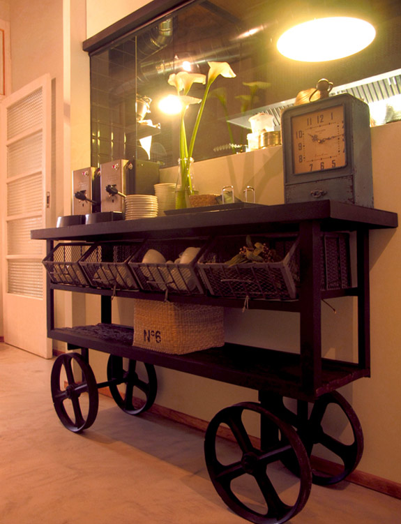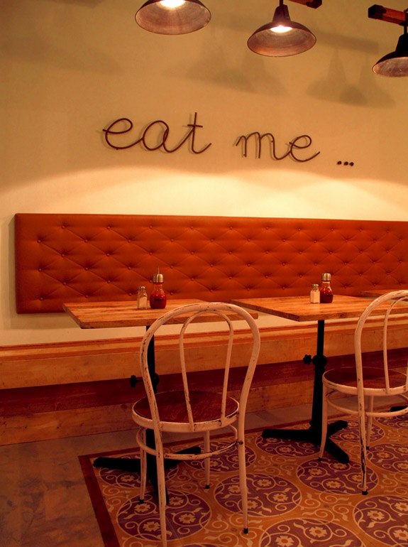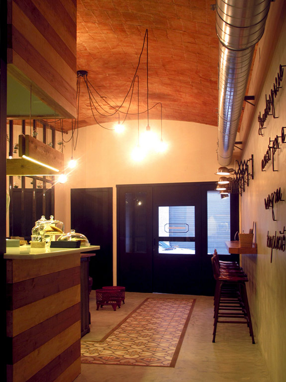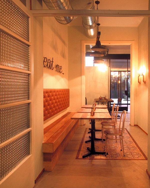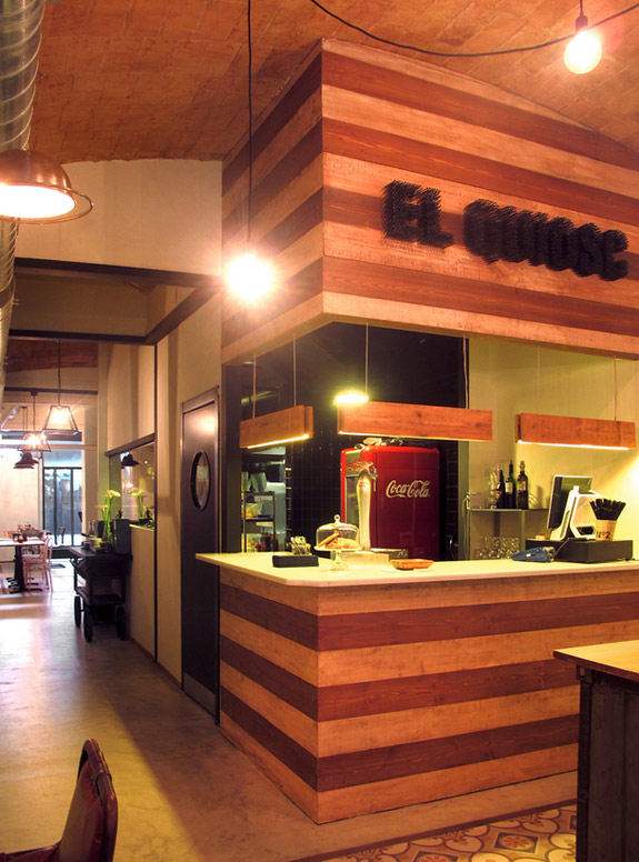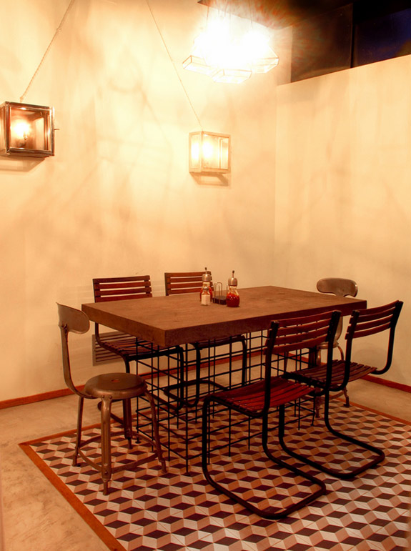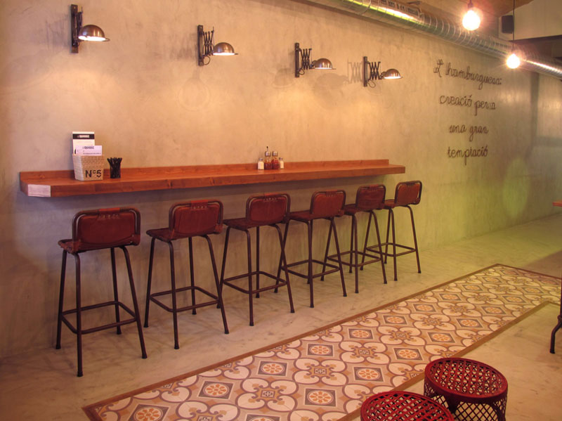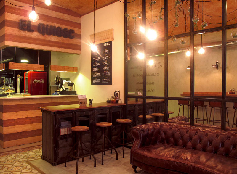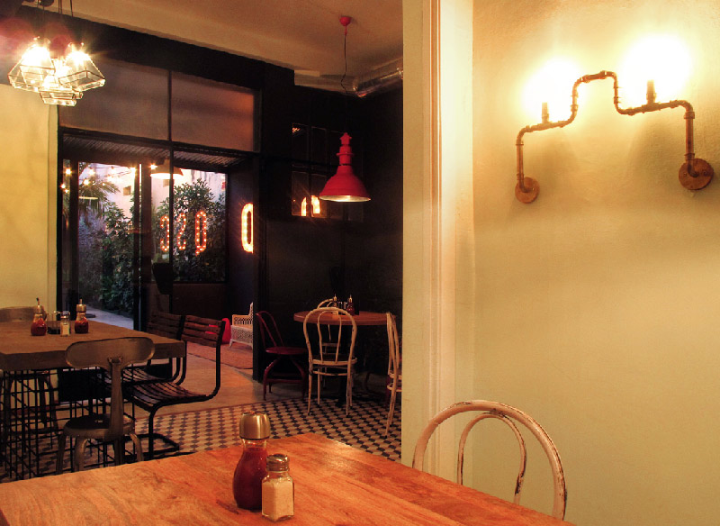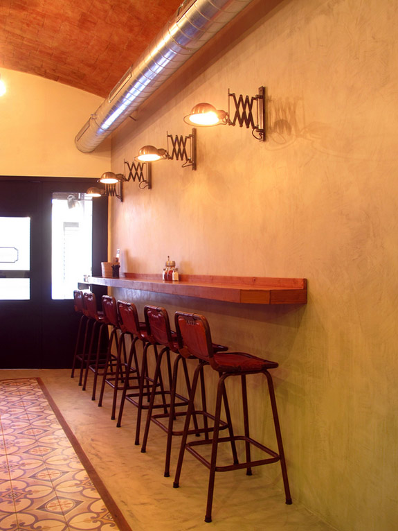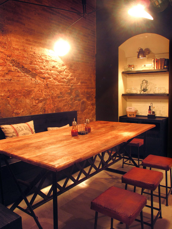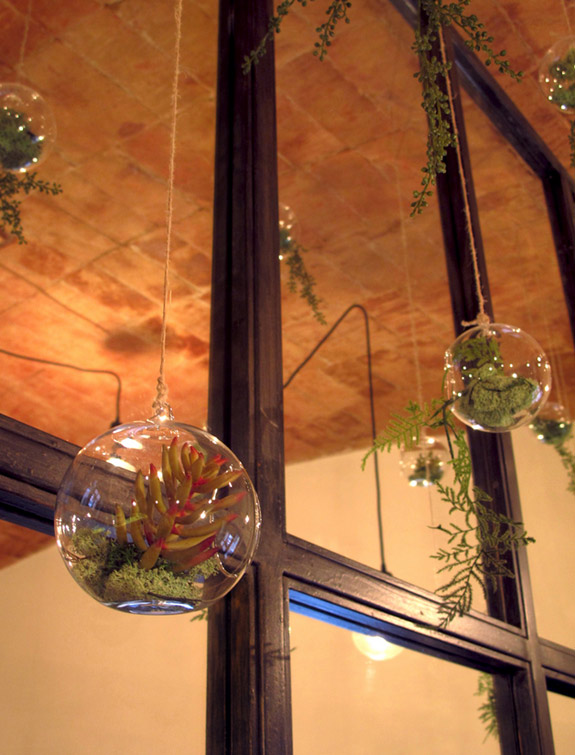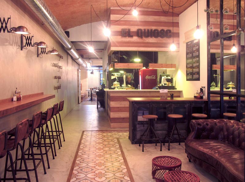 It is really unfortunate that Barcelona is no where near Ottawa because I would LOVE to check out this restaurant in person (and maybe even try a burger while I’m there). Alex of Blanco Azabache Interiorismo thought we would like to share this latest project of his with you all. It is a burger joint called EL Quiosc. It is an old house in the center of the town of Mataró (Barcelona) that after abandoning the shoemaker who had his workshop there decided to rent my clients to transform into a gourmet burger, with a industrial retro aesthetics (4 rooms, entrance area + the childs playground). As an aficionado of all things industrial, I love what Alex has done with this space. Lots of rustic and industrial touches with a French and Spanish vibe make this a quirky yet fun and inviting restaurant. There are lots of elements I would love in my own home – from every bit of lighting and seating to the hanging terrariums and tile flooring (YES!).