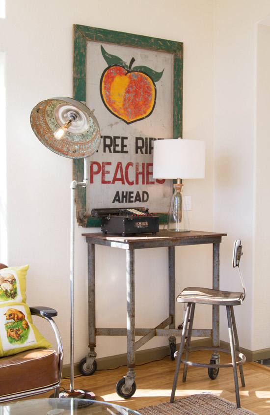 The rolling metal warehouse ladder used as a bookcase in the corner was found in the storage sheds at the Rogue Creamery.