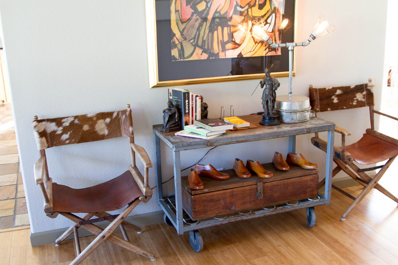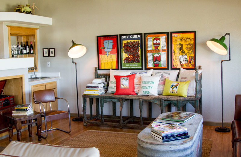 In the family room we scored the 8 foot long wooden bench that came from a train station in India at a local consignment store for $159. The upside-down galvanized watering trough is the perfect scale for sitting at the sofa or on a pair of paisley poufs and eating away from the dining room. We saved a puppy-chewed leather sofa by taking the gnawed cushions to a shoe repair store for patching & polishing – at a cost of $100, two chewed cushions were repaired and the rest were revitalized with leather polish.