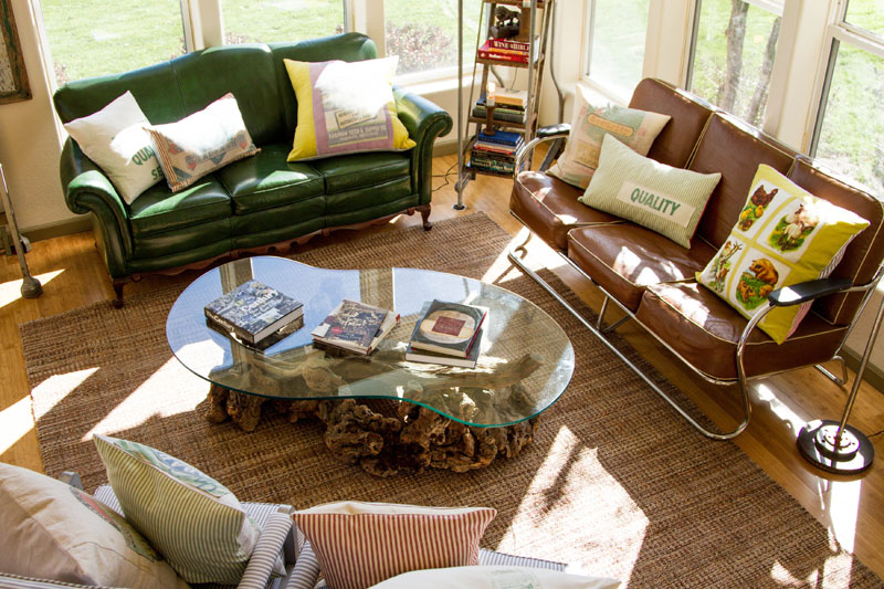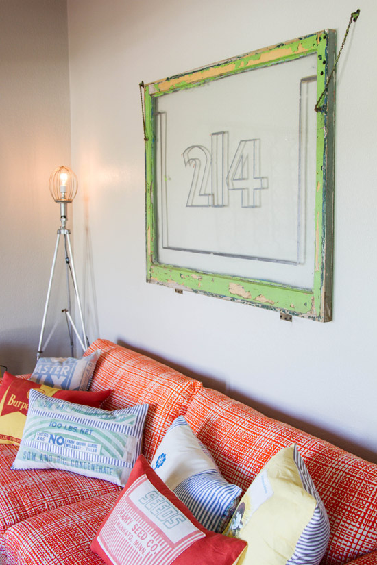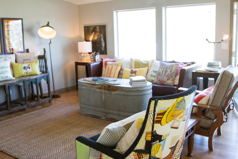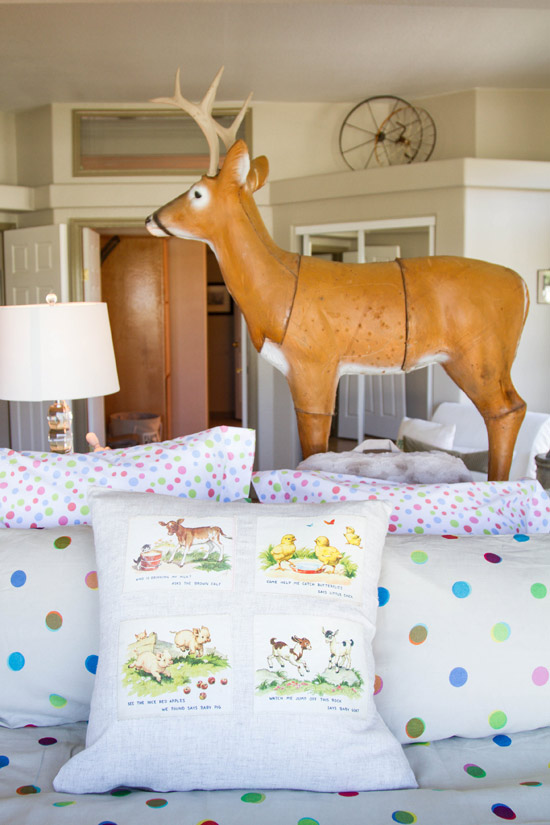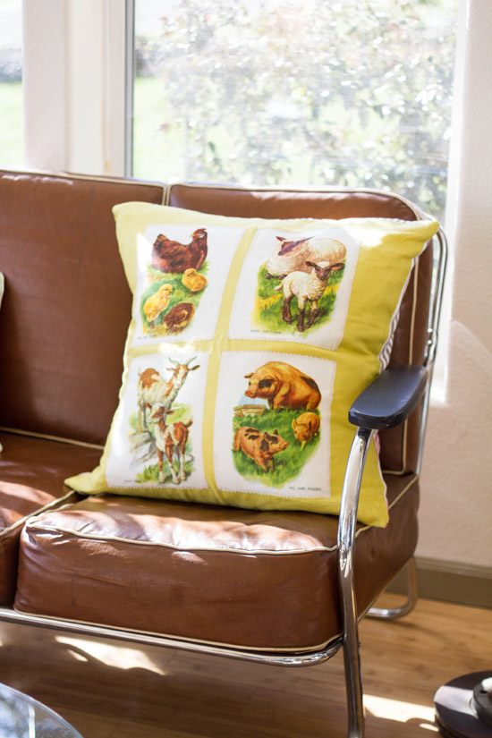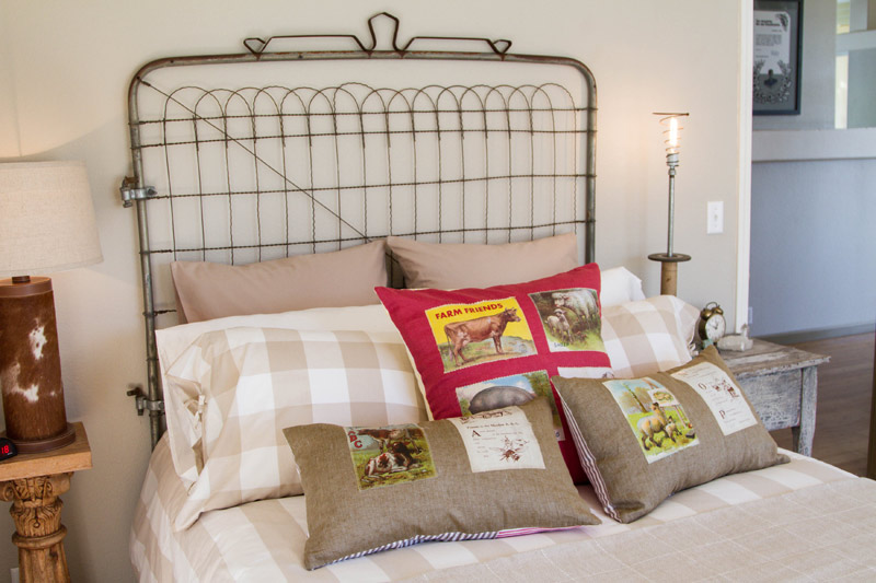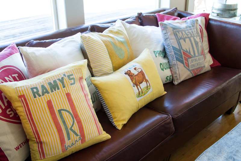 All of the pillows (except the two needle-point animal pillows on the twin beds in the cowboy room) were designed by me. They include a combination of vintage grain, feed & seed bags & pages culled from vintage cloth baby books (specifically those dealing w/farm animals – cows, pigs, chickens,etc.). The seed/feed/grain bags & baby book pages were paired with colorful hopsack linen (chartreuse, yellow, orange, red, etc.) and woven mattress tickings in primary colors. To form a less frenetic backdrop in some areas (long wooden train station bench & leather sofa in the family room) we scored multiple rayon sacks from etsy w/off-white backgrounds and the simple text “Premium Quality Seeds” in green type. We used a dozen of these particular seed bags whole and also trimmed to highlight individual words “Premium,” “Quality,” & “Seeds” on smaller pillows mixed throughout the house. All pillows are filled w/waterfowl feather inserts – a real luxury. Many visitors select the pillows as their favorite part of the house. Pillows are sewn by my go-to seamstress, Carmen Lawson (her husband was my nephews’ music teacher throughout high school). These pillows are available for custom order by contacting me.