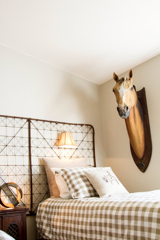 The metal gates used in the two guest bedrooms were no-brainers. Scoring the extra wide one behind both twin beds really brought that room together – Cowboy Room Gate Headboard – $60 – Cow Room Galvanized Cyclone Gate – $40. When I saw the fiberglass horse head at the Flea Market with a $300 price tag – I gulped and walked away. Then I went back – how could a pass on that showstopper when I was planning a “Cowboy Room” based on vintage cowboy artwork & minimal furnishings already on hand from the homeowners.