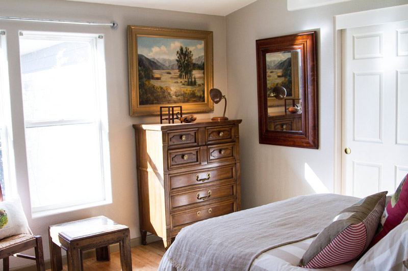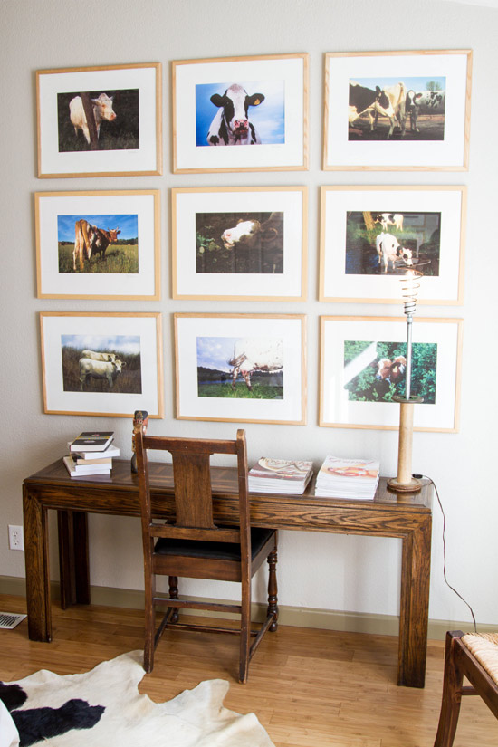In the Cow Bedroom, a friend had taken photos of the Rogue Creamery Cows – colorful shots w/bright blue skies and splashy green grass – nine of these were framed with large white mats and pre-made bleached ash frames (matting artwork into pre-made frame sizes radically reduces the cost of framing). This group of art is the focal point of the Cow Bedroom at a cost of less than $500.