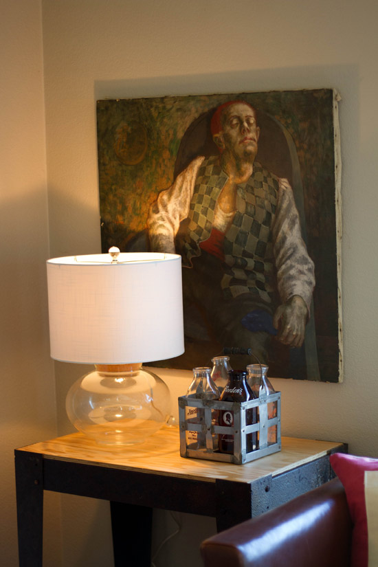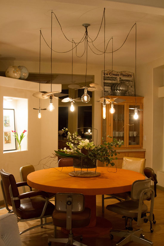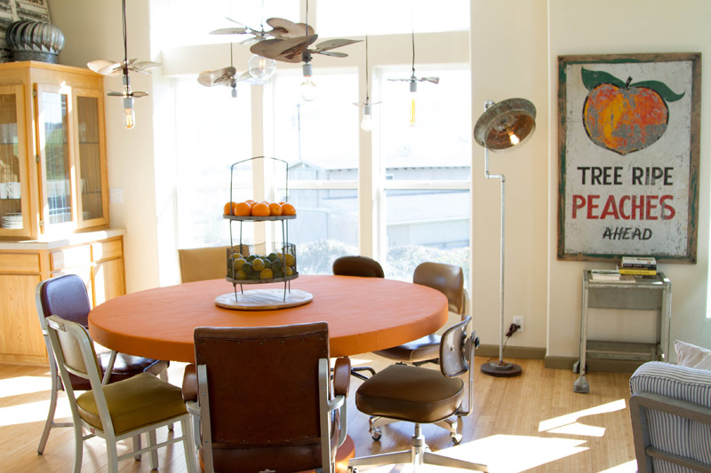 The orange “spool” style dining room table was the biggest round table we could find – it is 65 inches across – it was $85 on CL and was transported from the 1970s to the new millenium w/a quick sanding and several coats of Annie Sloan’s Barcelona Orange Chalk Paint. As the table is used and the finish may become chipped, scratched or worn – we plan to do some additional roughing up and add a hand-applied wax finish – in the meantime, we love it the way it is. Random vintage office chairs in browns & beiges (not the hottest colors scheme right now, but perfect w/the orange table) were nabbed for $10-$45 each at flea markets & thrift shops. Two of them still had their inventory tags from the Denver Post newspaper.