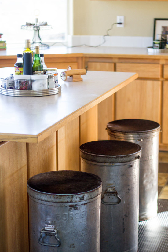 These milk cans used as bar stools in the kitchen with cowhide trimmed to fit the round tops were also found in the creamery’s storage shed.