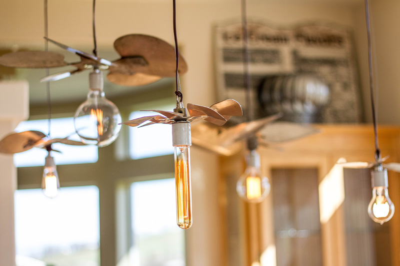 Above the dining room table – 3 of the 7 fan blades are galvanized paddles used to stir cheese curds from the bottom of the vat – all fans outfitted w/porcelain sockets & each one sports a different Edison style bulb.