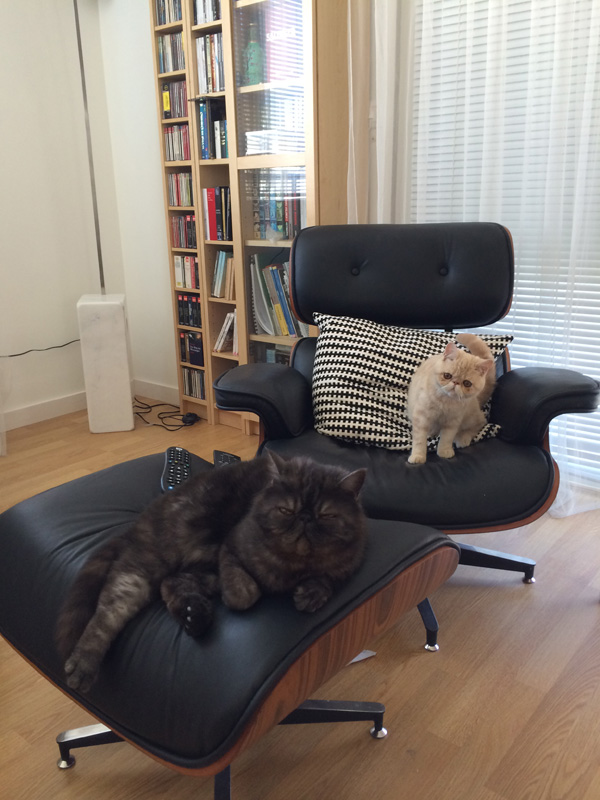 These are Ronin (the black one) and Pepe (the cream one), my two exotic shorthair cats, sitting in ‘their’ Eames Lounge Chair and ottoman.
