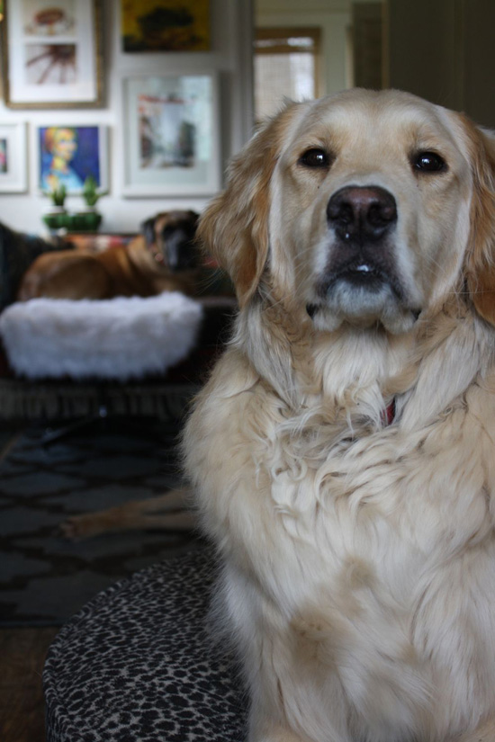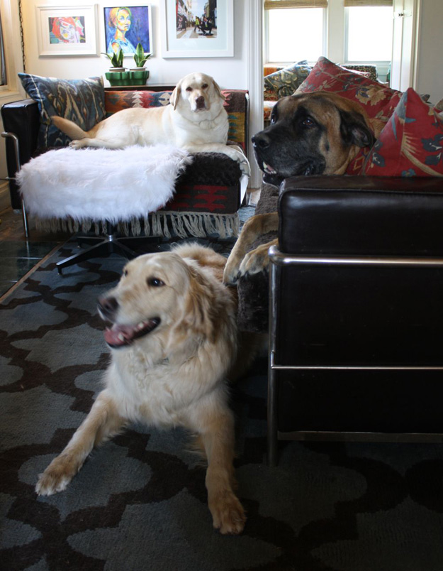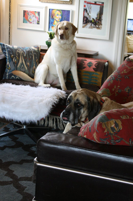 1 – Gibbie our rescued yellow Lab with Grace Ann our rescued English mastiff. The knockoff Le Corbusier sofas are dog beds at our house.