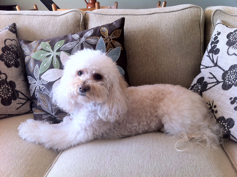 Toby a rescue dog from Austin,Texas now residing in Dallas. He was just groomed and seems very aware of his cuteness. He love pillows and cushions and often rearranges them for his comfort.