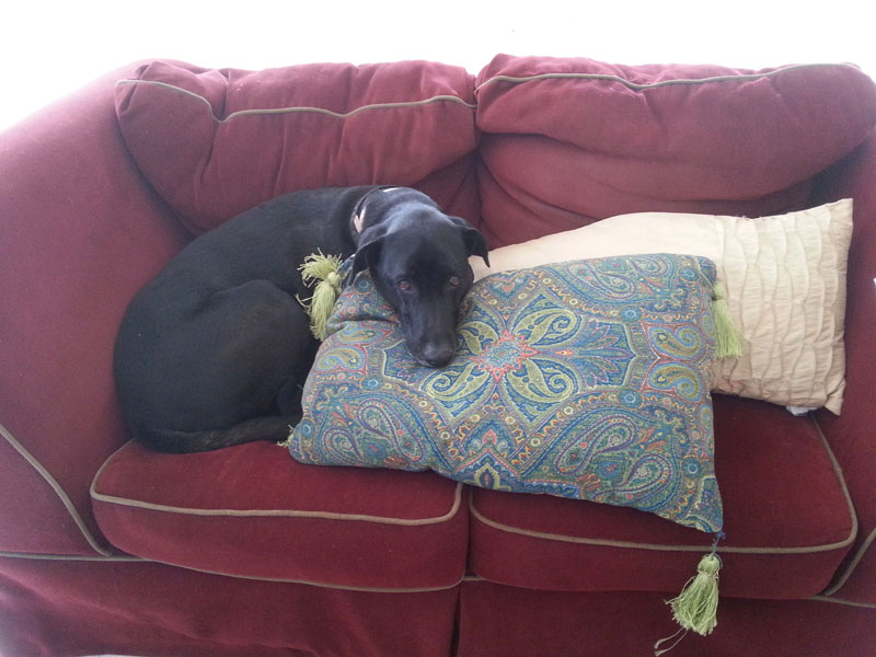 1 – This is Dirk, our nine year old rescue lab mix. He loves this loveseat. Company was coming so we put pillows on the sofa in order to gussey it up as well as keep Dirk off of it. As you can see, this ploy did not work with Dirk.