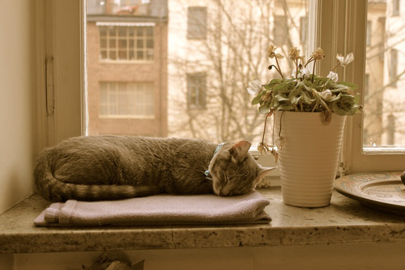 Speaking of those big windows with deep ledges, we’ve got those (or rather, my mother does) in her lovely flat’s kitchen in the middle of Stockholm. This was just too cute not to share, it’s our baby kitten Sylvester – or Sly – in his favourite spot. He was a farm cat destined for a bag in the river until I saved him last summer and brought him home with me. Now he spends all his time on this window sill with a perfect view of the happenings down on the ground, as well as a perfect distance to the fridge for a snack every now and then.