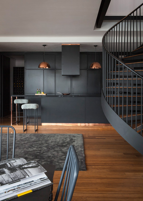 The Cubo House, additions to a heritage listed double storey building by Melbourne architecture firm Phooey. Why Cubo? “The project applies the surrealist technique of “Cubomania” to catalogue, re-use & re-invent the demolished building materials.” The stand out feature of the new space? The staircase which spirals up and down through three levels topped by a creative re-use chandelier.