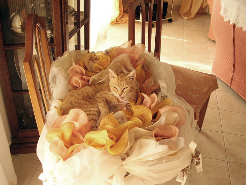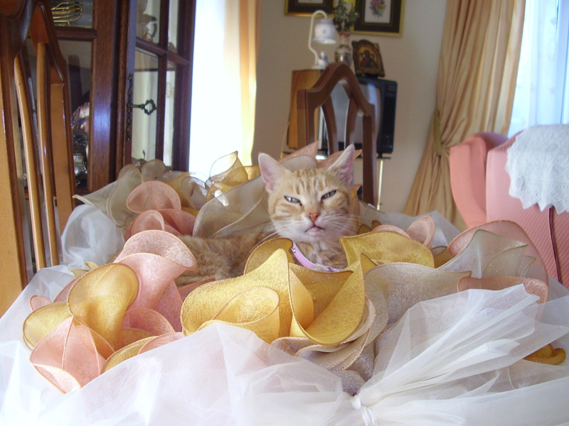 That’s a photo from 2006, on my sister’s wedding day, when our cat Turbo felt she needed more attention from everyone! So she made herself at home inside the basket with the wedding’s decorations! (That’s actually small bags of veiling filled with candies and they are given to the guests after a wedding.) She got really annoyed when we woke her up, she looks quite sleepy on the photo, doesn’t she?? Since this beloved cat died in 2010 at the age of 20 years old, I wanted to share it with you!