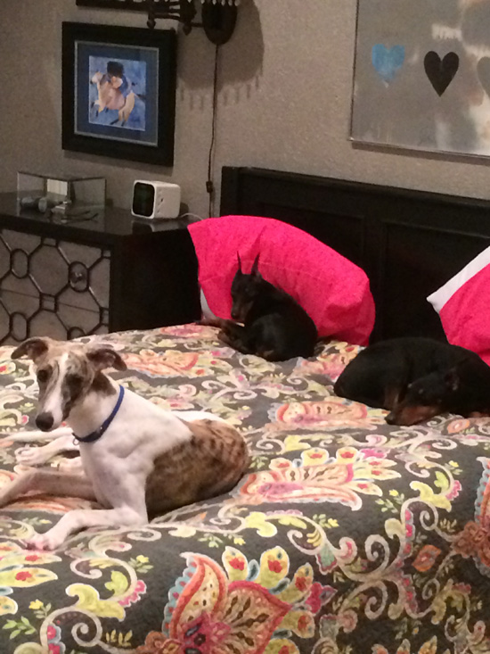 Whippet Hunter 9mo & Manchester Terriers Bling and Jimmy Choo watching late night Saturday TV!