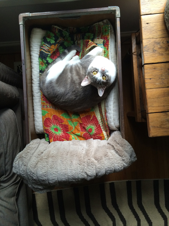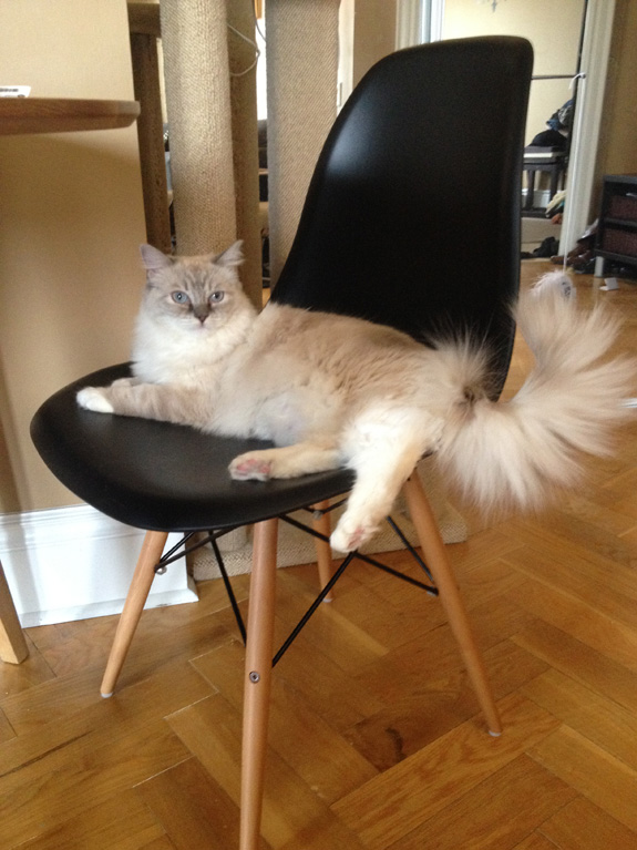 This is Coco, a one-year old blue lynx Ragdoll. The sweetest, fluffiest Ragdoll I’ve ever known. She loves sleeping in bags, but when there isn’t one handy a bit of midcentury furniture will do nicely.