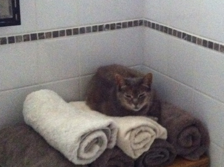 1. Our cat Arwen snuck into the bathroom to sleep somewhere warm (I used a pellet for towel storage)