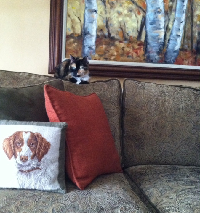 My beautiful 20-year-old calico/tortie, Pita, maintaining her ever vigilant watch in one of her favorite vantage points, the back of the sofa.  A needlepoint likeness of my Brittany spaniel, Tilly, keeps her company.– Martha (Englewood, CO)