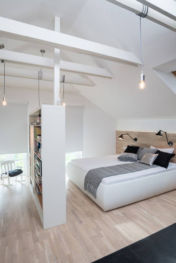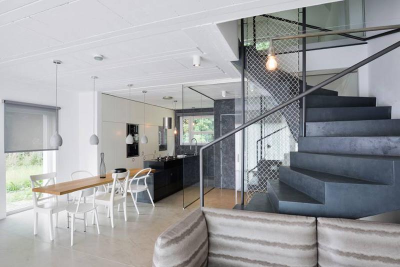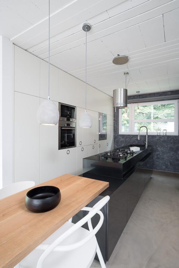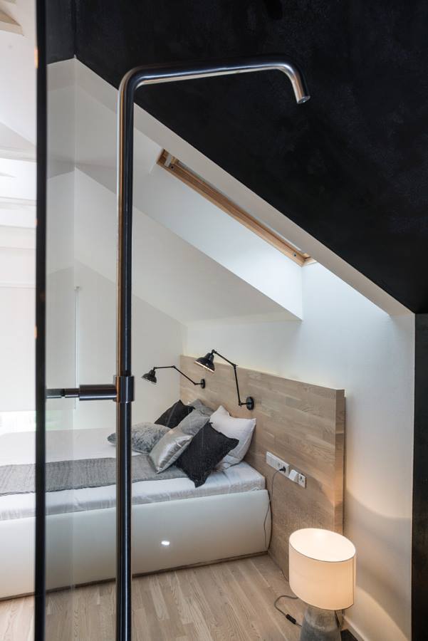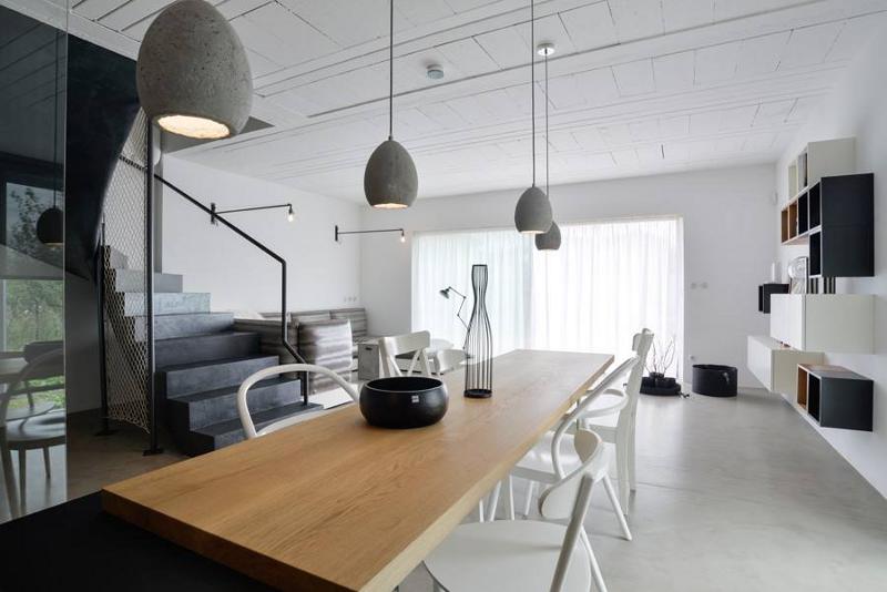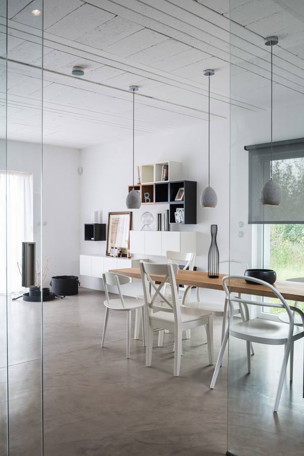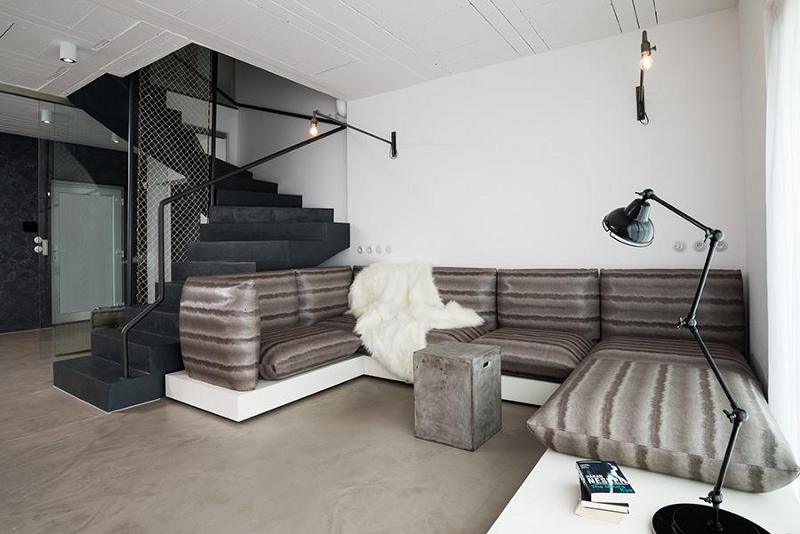 A colour palette of black, white and grey. Slick, hard surfaces. Think concrete and metal warmed sparingly with wood. Too stark? Too cold? Or just right for your minimalist style? My favourites? the bathrooms especially the white one and the box shelving in the living area. Modern interiors by Prague based OOOOX Architects.