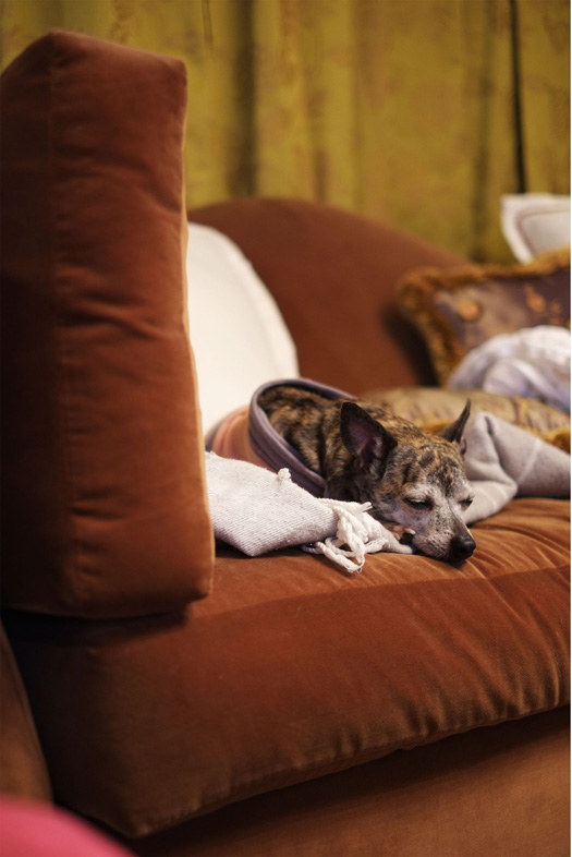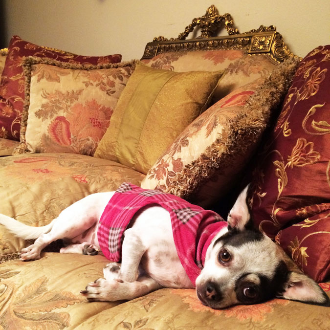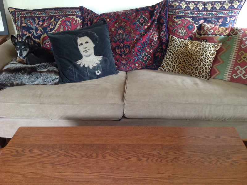 This is Gypsy on my World Market sofa. I replaced the back cushions with three euro pillows (perfect fit!) for more pattern and comfort. Gypsy loves pillows almost as much as I love thrifting for them.