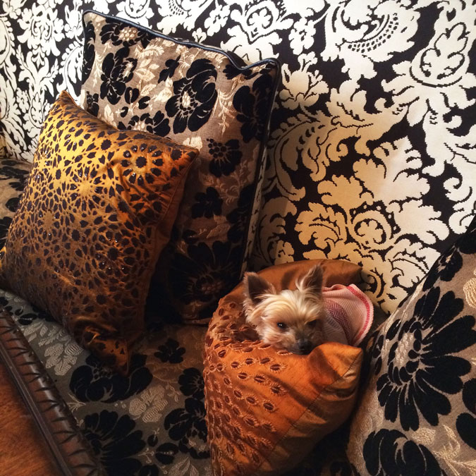 Here’s a double whammy courtesy of Ms Pickles. She’s in her new favorite spot on my Remington chair, lounging on my Margo Selby pillow.