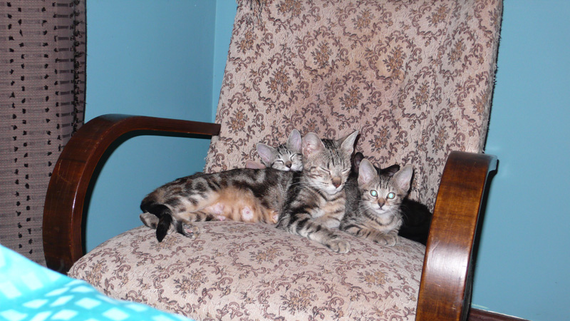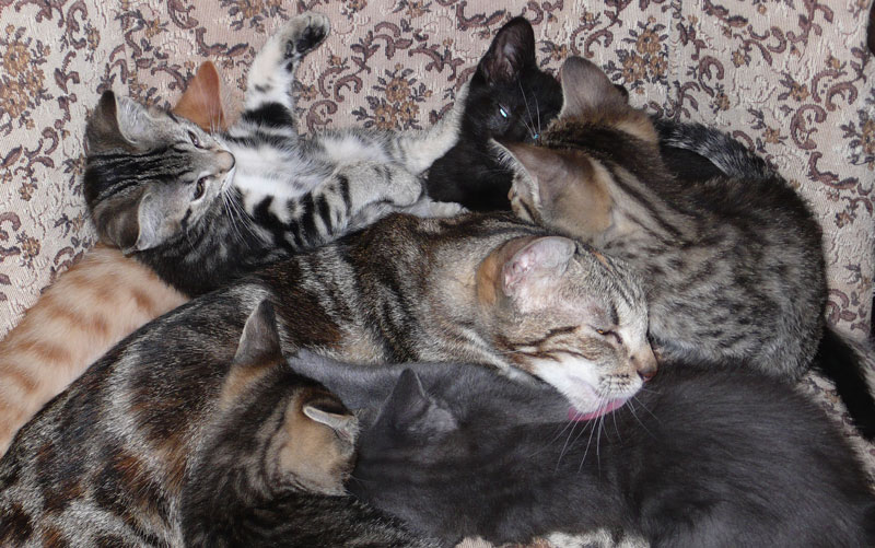 First time fostering for the local shelter, was given Chickpea (mother cat) and her seven unnamed kittens. They are getting over the flu.The first photo is day one of fostering when they found a comfortable chair, the second photo is moments later.