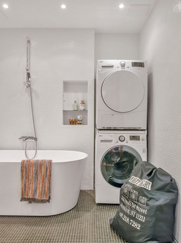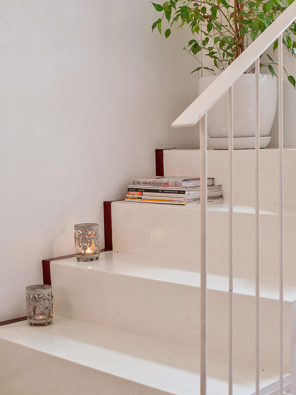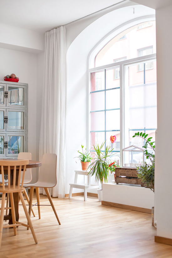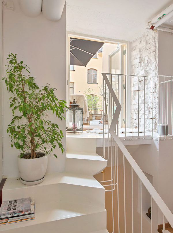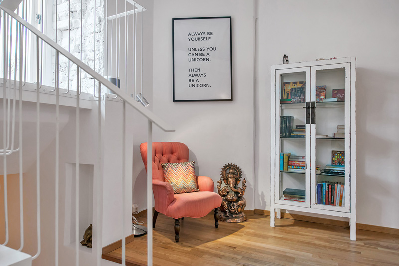 Mattias Wikman emailed us with some beautiful photos of his townhouse-style apartment in Stockholm. The space is an old storefront that was converted into an apartment with a own private entrance and some outdoor space. It is located in the middle of Stockholm in an area called Birkastan. I love that all the walls/ceilings/ductwork etc. are painted white. It makes everything so bright and forms a blank canvas for the furnishings. And it definitively feels like a loft so I really dig that. And Mattias has my favourite quote hanging in the photo below – bonus points!