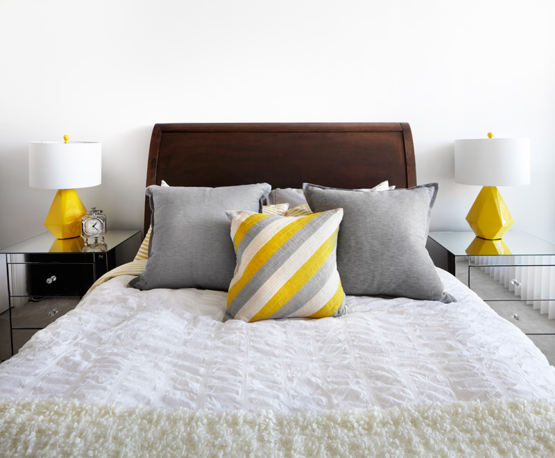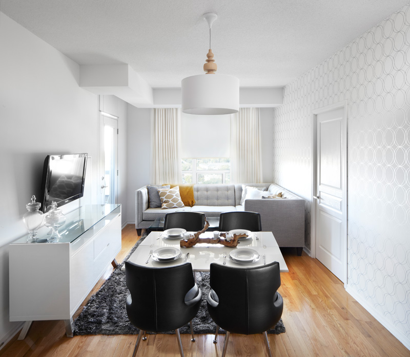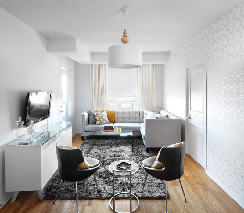 Toronto interior design firm Lux Design creates modern, boutique-hotel type spaces that are understatedly luxurious and sophisticated. They know exactly what they are doing when it comes to small condos and making multi-purpose spaces. With this first project Lux Design was asked for a gender-neutral colour palette and was required to create several zones from an awkward elongated room. LOVE the grey, white and yellow scheme they selected.