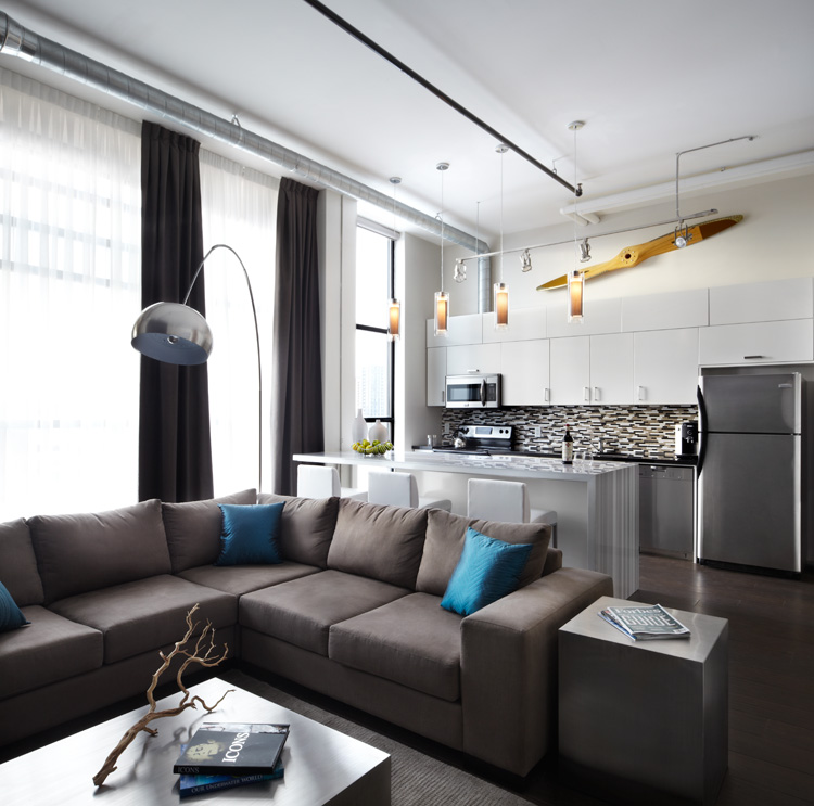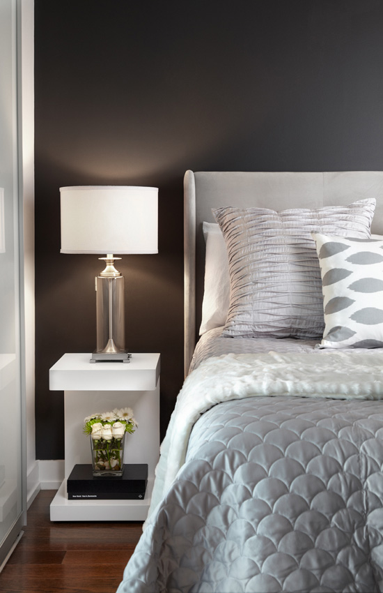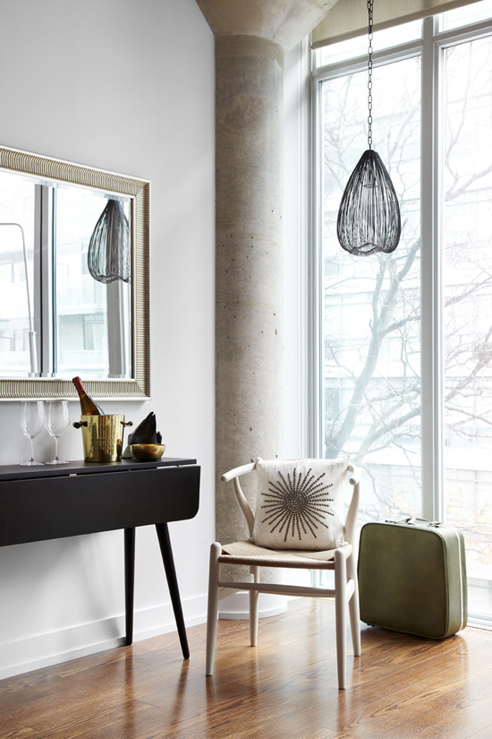 I have a couple more projects from Lux Design for your viewing pleasure. This first one in black, grey and white is really stylish. It is a small condo that called for smart use of an every-day dining space. A console table serves as a desk and is pulled out as a dining table when entertaining.