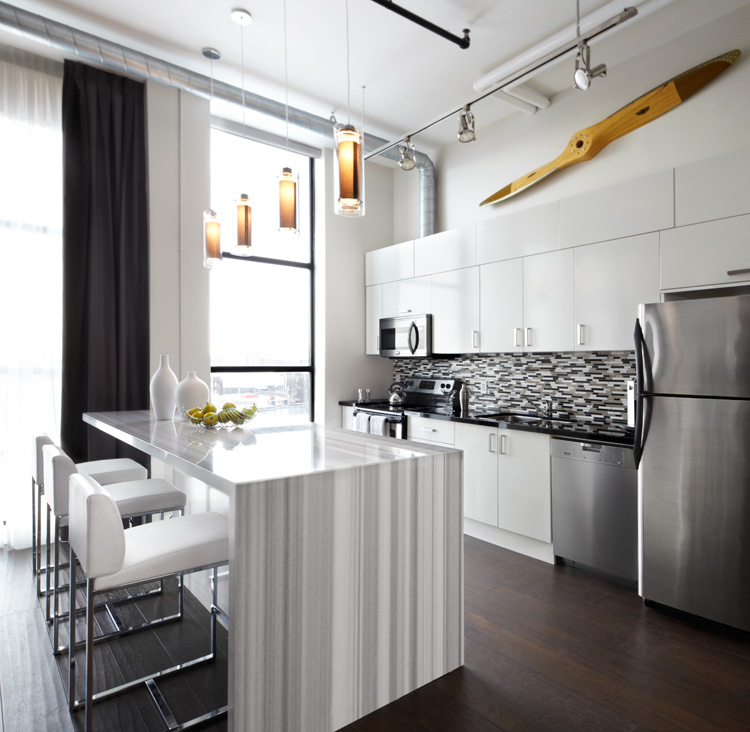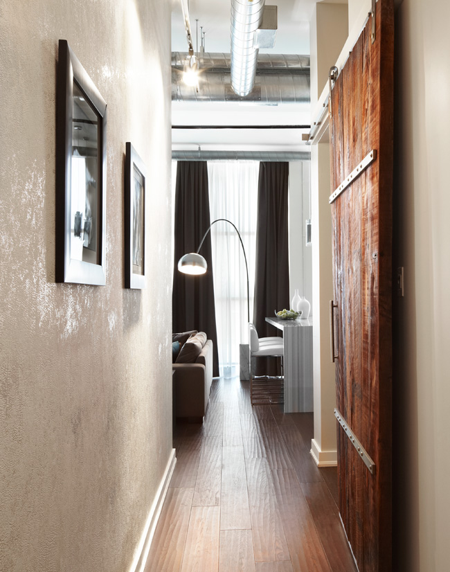 Next up – a bachelor pad with some cool features such as a reclaimed barn wood sliding door in the hallway and a custom entertainment unit created from high-gloss resin.