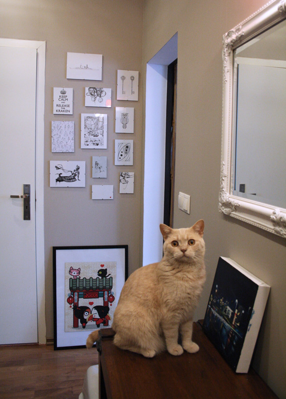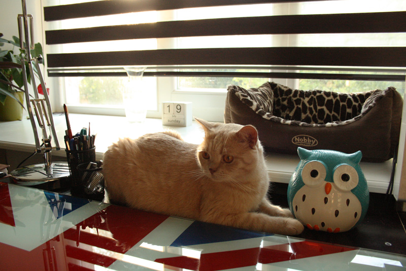 This is our cat Mandarin. On the first picture he is sitting in the hallway on the wooden cabinet (he looks a bit shocked, because he thinks that he is not allowed to sit there). On the second picture Mandarin is on my desk, and this is one of his favorite places.
