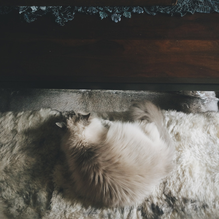 Here are a couple from me. Saturday morning I spotted Milo once again on the bench in the dining room. It is his new favourite spot. (Stick a faux sheepskin on anything and it becomes the favourite spot!)