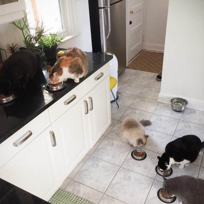 And a few from me. Lucky chillin’ on the couch next to my new fabulous Ikea cushion…the herd at chow time…and the first time we all hung out in the new backyard (kitty approved).