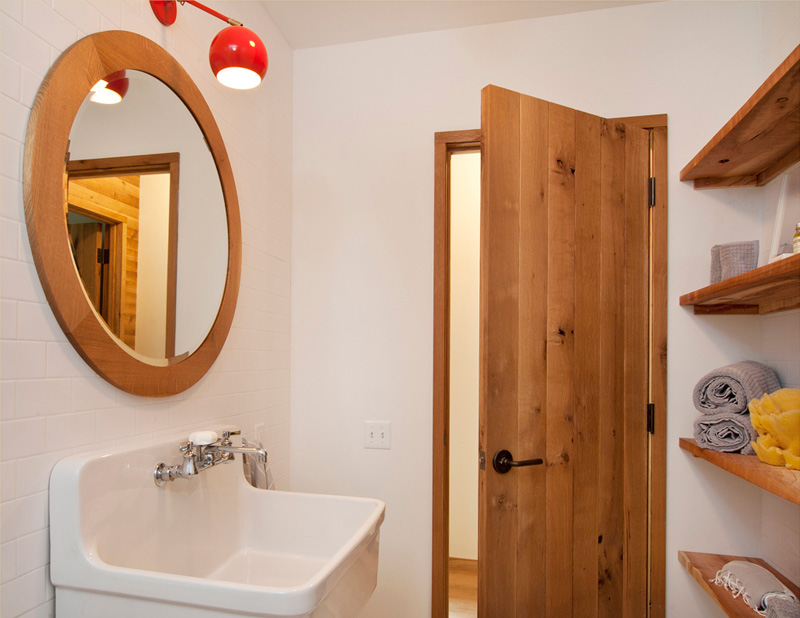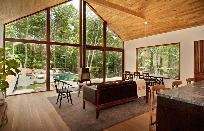 Good example how much wood can still be sleek and modern and timeless. I love those big windows! And concrete bathroom sink is beautiful.