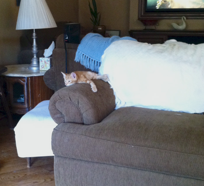 This is the little ginger kitten my son just brought home. My son named him Ares (after the god of war), but my granddaughters call him Pumpkin and lately I’ve been calling him Fred Weasley because he’s into so much mischief that I’m afraid it’s going to get him into trouble! At any rate, here’s a photo of him completely worn out from upending my houseplants!