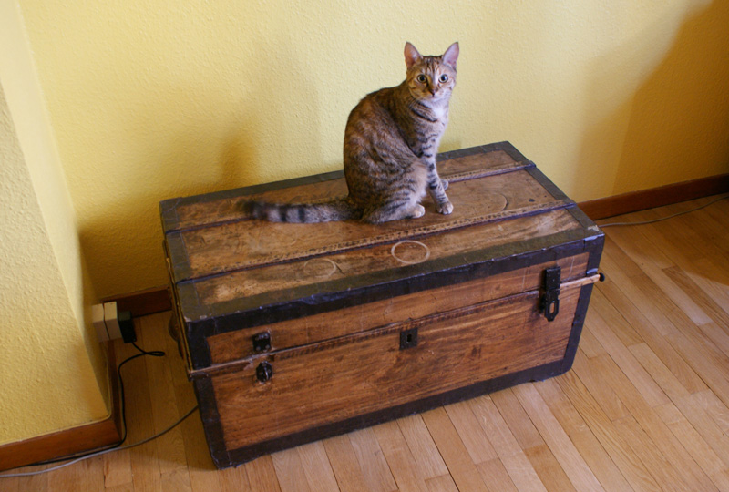So here’s my little cat, Pixelle who turns 2 years old on the 31 of August. She’s named like that because she enjoys watching me play video games on my computer (and because Pixel is a boy’s name, we all know that ^^) On the first picture she was still a baby cat, sleeping on what used to be an Ikea shelf, that I turned into a climbing tree/cat house. On the second one, she happened to jump on my newly acquired 19th century wooden chest when I took the picture. By the way she loves to hide and sleep in it !