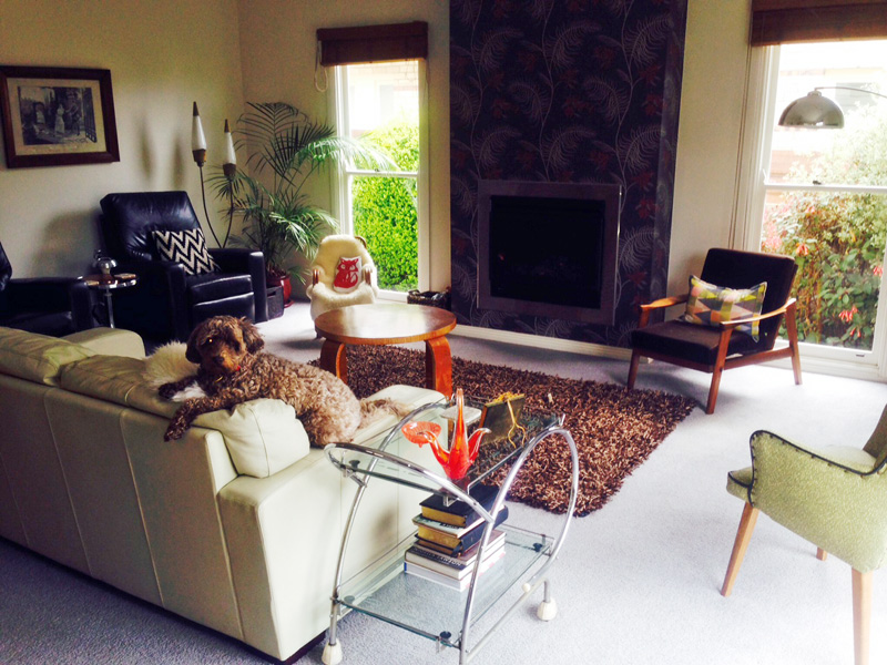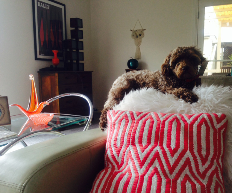 Molly, our chocolate spoodle enjoying her favourite spot on the back of our couch.