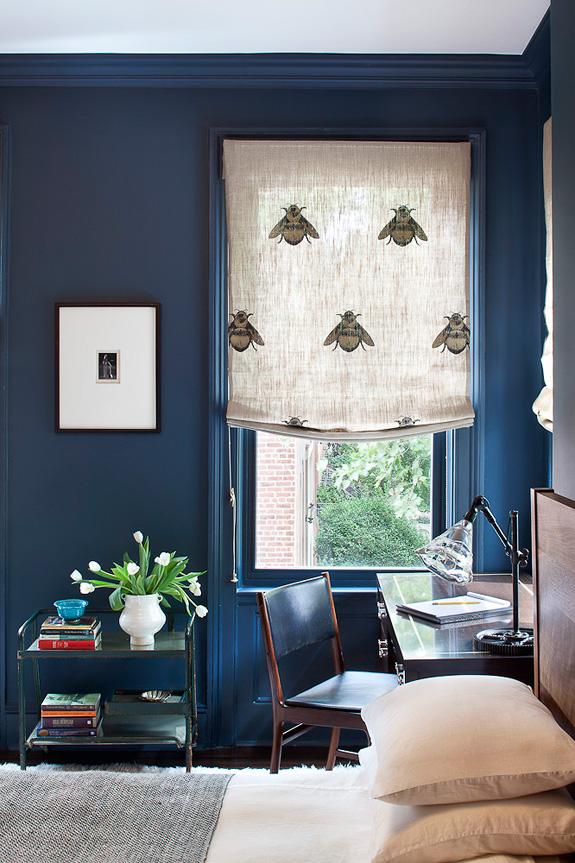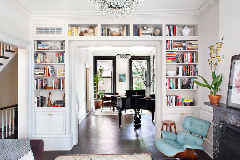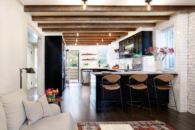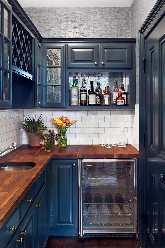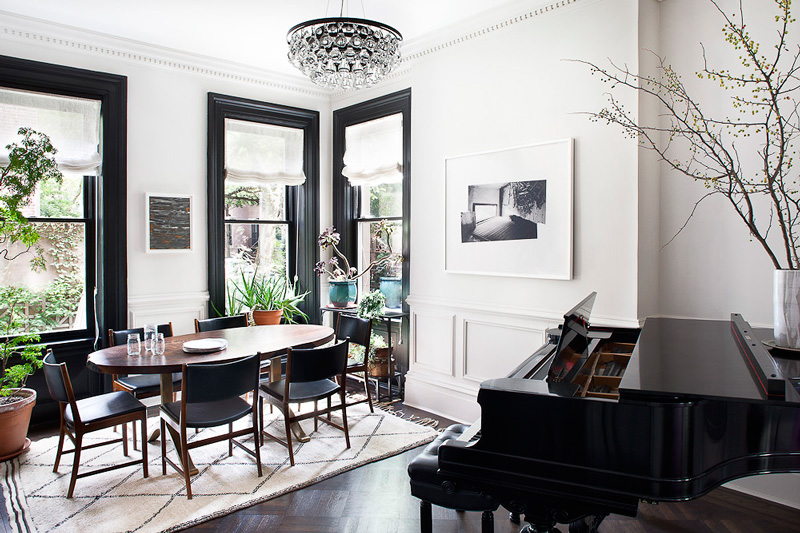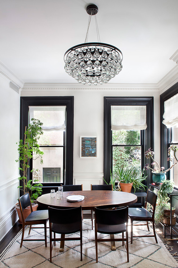 I love every inch of this Cobble Hill townhouse designed by Blair Harris. The black trim in the dining room, the dark floors, the black and white kitchen complete with subway tiles, butcherblock counter and exposed beams and that beautiful blue (I’m considering a similar colour for my kitchen). Fresh and sophisticated, while very welcoming.