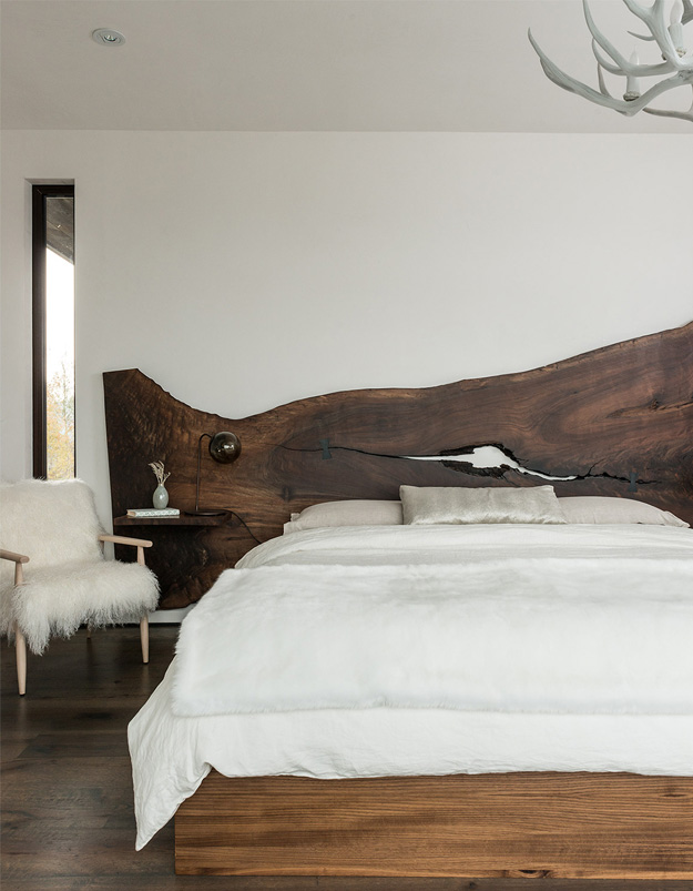 This is a gorgeous cabin! Love the copious use of wood, from the 'rug' to the headboard and so on. Also, the antler chandelier is a great touch.