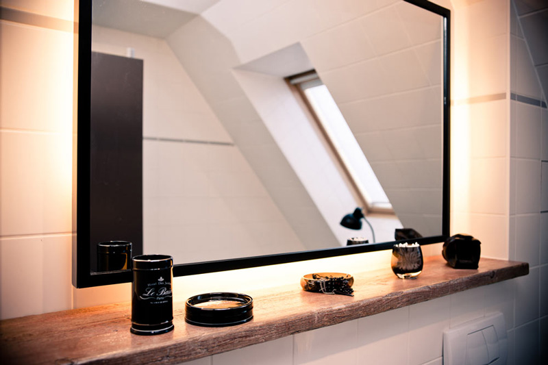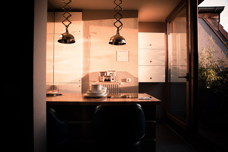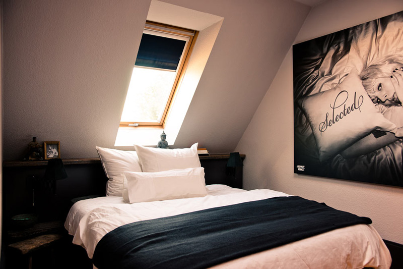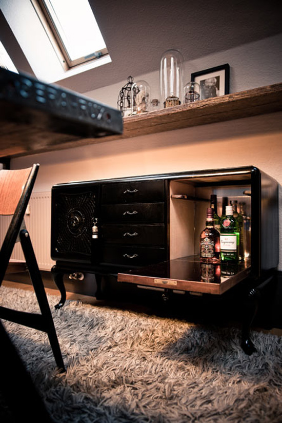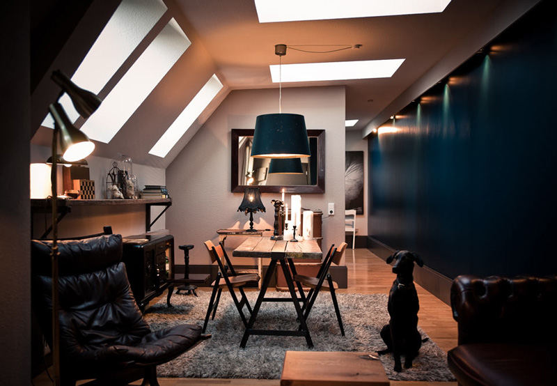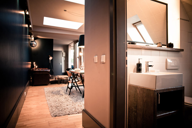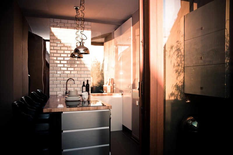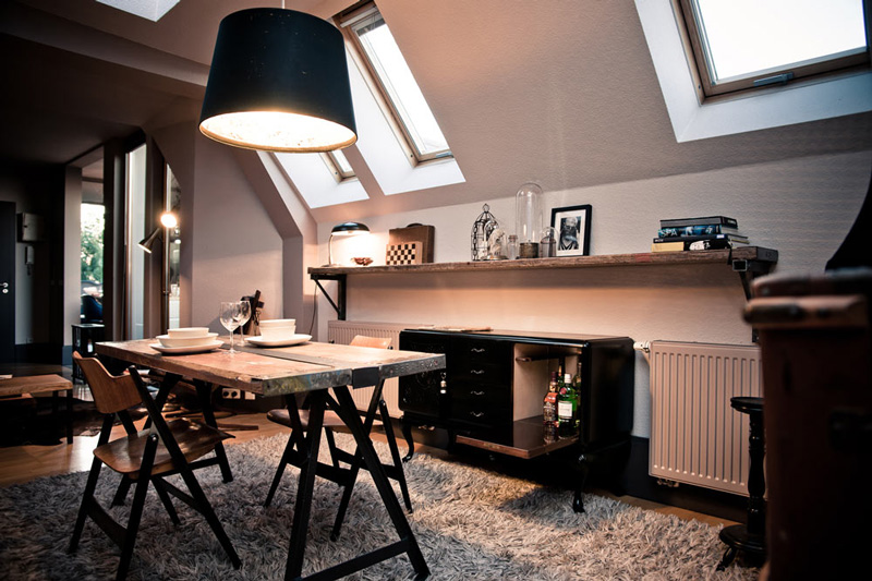 This 70apartment also designed by Berlin’s NOVONO is pushing all the right buttons for me as well. Where the first apartment had a global vibe, this one is more masculine and industrial. What’s not to love? It is mostly black and white, has my dream chesterfield, a glorious dark teal accent wall, black and white colour scheme, reclaimed wood features throughout and subway tile in the kitchen. Yes, I adore this one too.